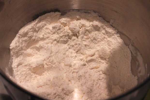 Tamizar juntos la harina, polvo de hornear, bicarbonato, sal y azúcar. Mezcla en los cubos de mantequilla fría ligeramente hasta que se asemeja a la harina de maíz gruesa.