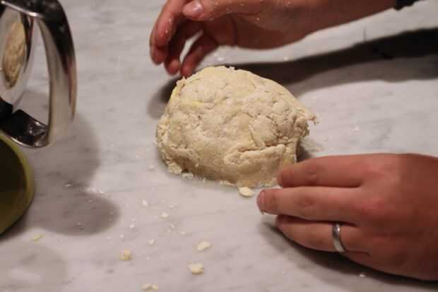 Ligeramente bata el huevo, batir la crema y la mantequilla en un tazón pequeño. Hacer un pozo en el centro de los ingredientes secos y verter los ingredientes húmedos. Mezclar la masa hasta que apenas viene junto y uniformemente húmedo. Todavía parece un poco peludo. Recoger la masa y amase suavemente varias veces hasta que se forme una bola de masa suelta.