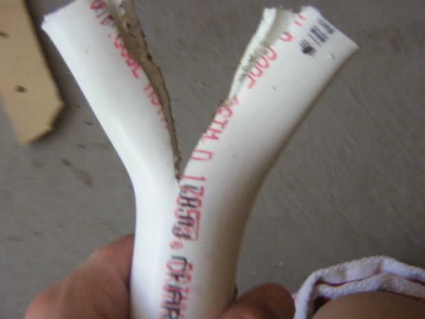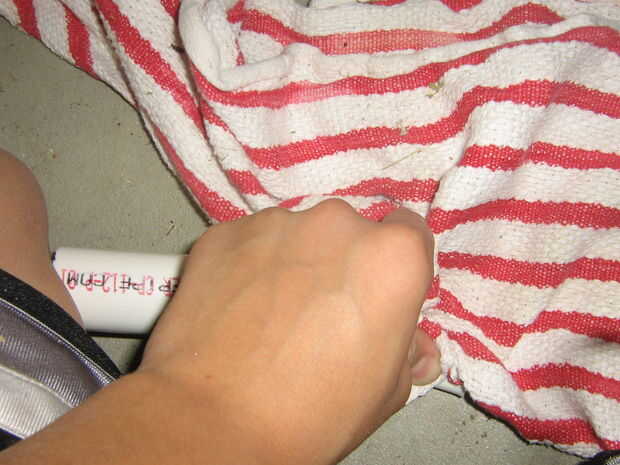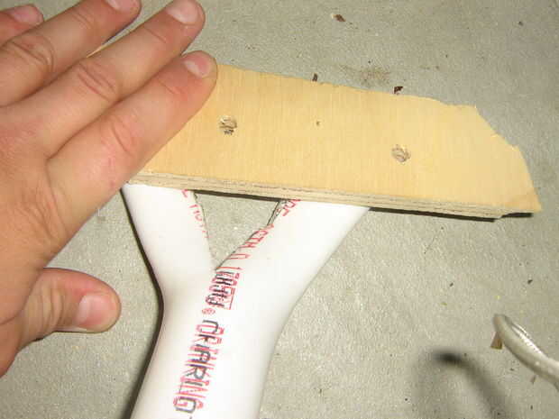 Ahora que el PVC es caliente usted debe tirar las extremidades de la eslinga de tiro en su lugar con un trapo. a continuación, mientras está todavía caliente de la prensa con algo de madera y el cuerpo se hace.