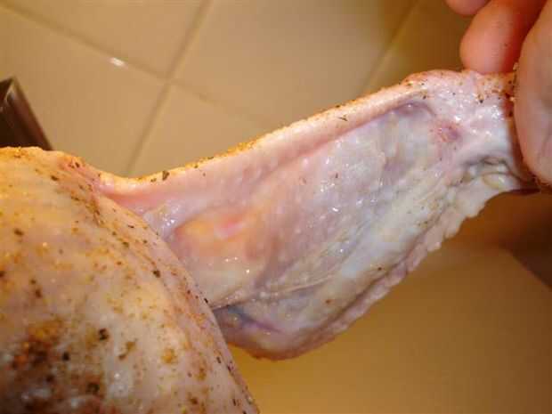 Colocar puntas de las alas detrás del pájaro como se muestra en la imagen siguiente. Me gusta cortar la piel del ala antes de hacerlo. Creo ayuda a mantener las alas en esta posición mientras se cocinan.