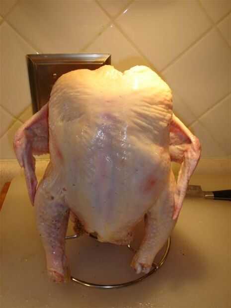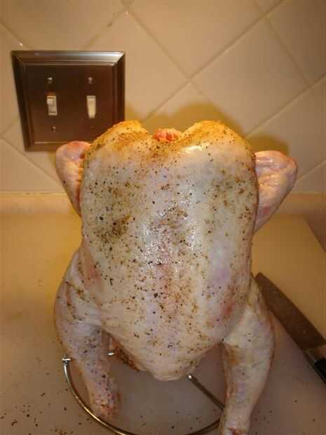 Coloque el pollo en el soporte. Si no tienes un soporte puede introducir una lata de soda o sopa en la cavidad del cuerpo. No utilizo una lata de cerveza en el soporte para esta receta como un experimento. Realmente no creo que hace la diferencia. La wsa de pollo apenas tan húmeda como cuando he utilizado una cerveza puede en el pasado.