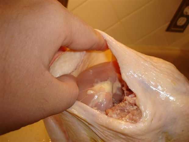 Separar la piel de las mamas en cada lado y espolvorear condimentos directamente sobre la carne. No tienes que trabajar abajo porque los jugos hará para usted.