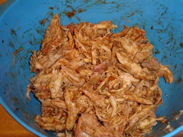 Ahora puede Agregar la salsa de barbacoa favorita. Sólo añadir lo suficiente para cubrir ligeramente y humedecer el pollo. Usé una tradicional salsa roja embotellada junto con algunos de mi salsa de mostaza casera.