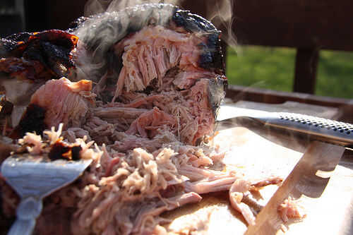 Asado de cerdo, lento cocinado con vino de Borgoña, caldo de carne, salsa de soja, jengibre y tomillo. La carne de cerdo es luego triturado y comido el pan de sándwich con salsa BBQ.Ingredientes:1 Paletilla de cerdo (el más grande que usted puede enc