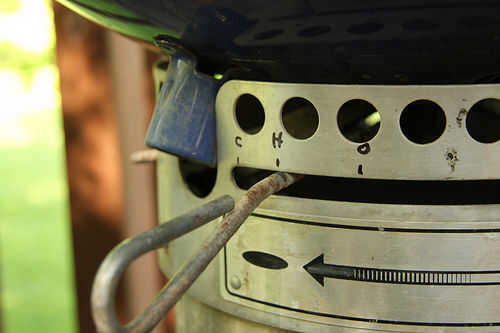 La temperatura de la caldera debe ser alrededor de 250 grados. Esto se hace mediante el control de las ventilación superior e inferior de la parrilla para restringir el flujo de oxígeno. Para hacer control de las ventilación más fácil, he marcado la posición de los orificios en el colector de la ceniza de fondo. Para empezar, desplace la rejilla de la parte inferior a la mitad y cierre la rejilla de ventilación superior casi todo el camino.