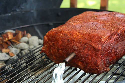 Con humo saliendo de la parrilla y la temperatura del calibrador de alrededor de 250, usted está listo para colocar el cerdo en la parrilla.