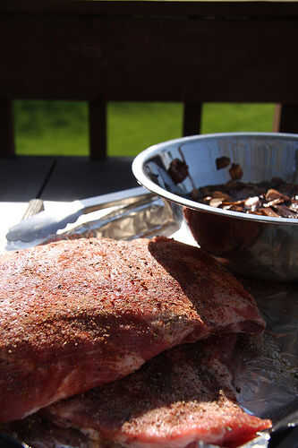 Una de las claves del buen cerdo tirado, es humo. Es fácil añadir humo a la parrilla. En primer lugar, recoger una bolsa de virutas de madera (de la tienda, no la tierra... a menos que por supuesto ya tienes algunos chips, en ese caso usted probablemente será recoger desde el suelo). Para carne de cerdo, utilizo una madera dulce como arce o apple. Usando cualquier otra cosa, como el mezquite, podría proporcionar demasiado áspero de un gusto.