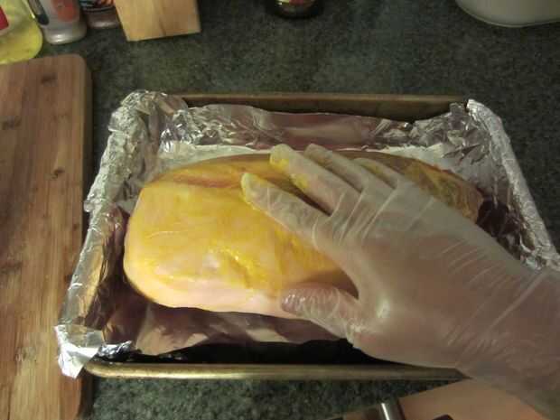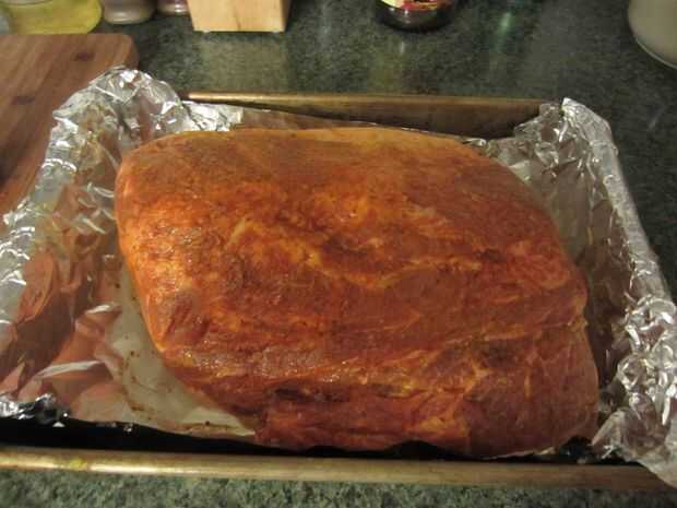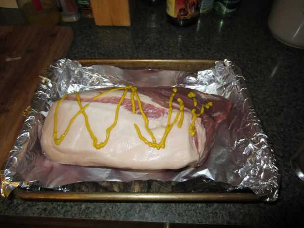 Adobo la carne de cerdo la noche anterior con una mezcla de mostaza y mi casa mezcla de la especia de barbacoa que he refinado a través de los años. Primero difundir una buena cantidad de mostaza (1/2 taza), luego seguido por una cantidad generosa de tu bbq favorito seco frote (aboud 1/2 a 1 taza). Tapar y dejar en la nevera durante la noche en adobo.