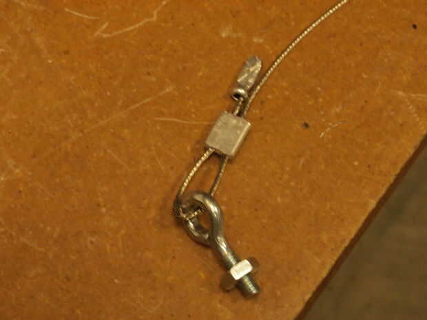 Para nuestro sistema de gatillo, utilizamos cables de bicicleta, pernos de ojo y cosas de la encrespadura. Primero creamos un bucle del cable de bicicleta que en el primer gancho de ojo para que quedaría todavía. Entonces, hicimos un segundo bucle más adelante que podría resbaló sobre el gatillo, por lo que uno podría ser utilizado para continuar con el sistema. Luego tejió a través de la primera y segunda cáncamos en la parte del caso. Después de eso, nos llevó a través de un prensado, el orificio en la parte superior de la cartera, a través del anillo de claves y en el agujero y a través de la prensa. Hemos aplastado luego los dos juntos y tada!