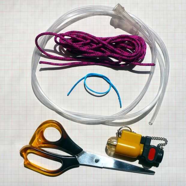 Para herramientas necesitará tijeras o un cuchillo afilado, un encendedor y una corta longitud de cuerda de nylon que puede ser empujado a través de la tubería plástica con facilidad. Debe ser más largo que la longitud de la tubería que cortará (ver paso posterior).