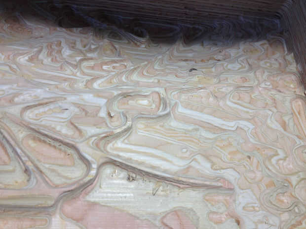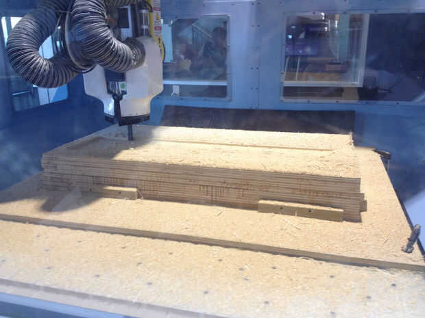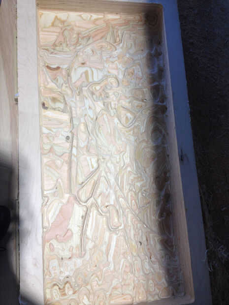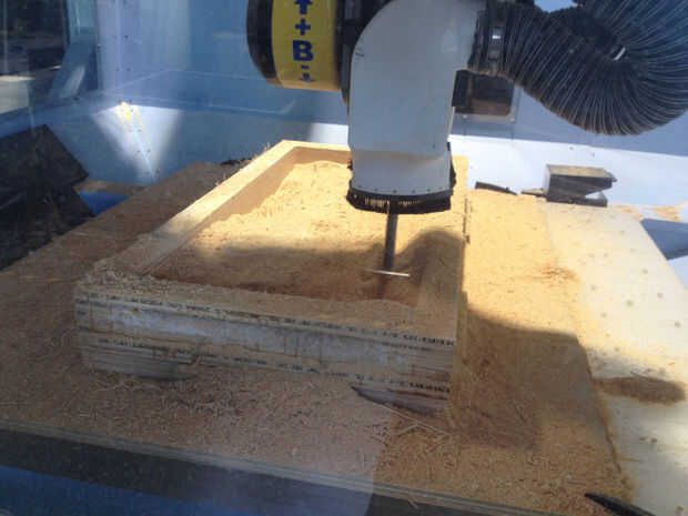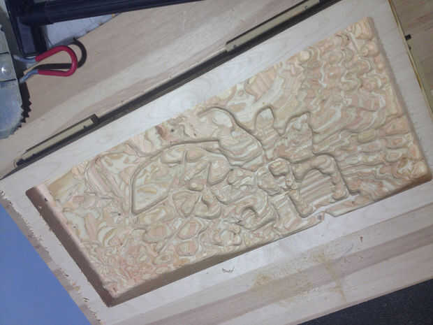 Corrí las pasadas de desbaste y acabadas a velocidades similares en comparación con la parte delantera. Resulta difícil ver lo que estaba sucediendo, otra vez por el serrín, pero el tiempo que se convirtió en más confianza que todo estaba funcionando según el plan. Cuando todo hubo terminado, ¡ a aspirar el polvo y reveló la parte de atrás!