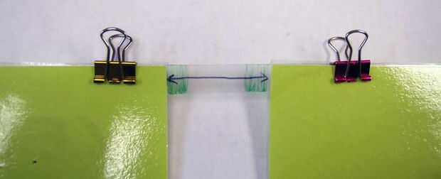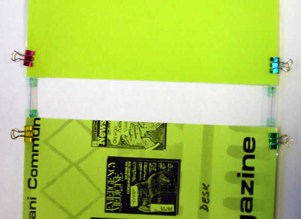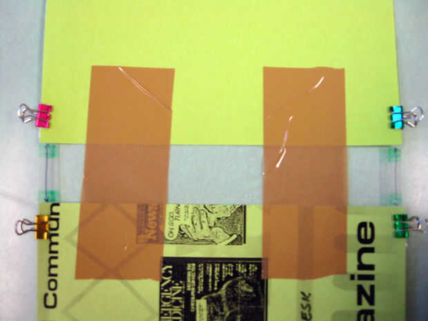 Conectar la parte superior e inferior con 2 tiras de claros de 1.5 "- 2" ancho fleje cinta: unos 4 a 5" de largo. Voltee las piezas y hacer lo mismo en la parte posterior, para que ninguna parte pegajosa quede expuesta.