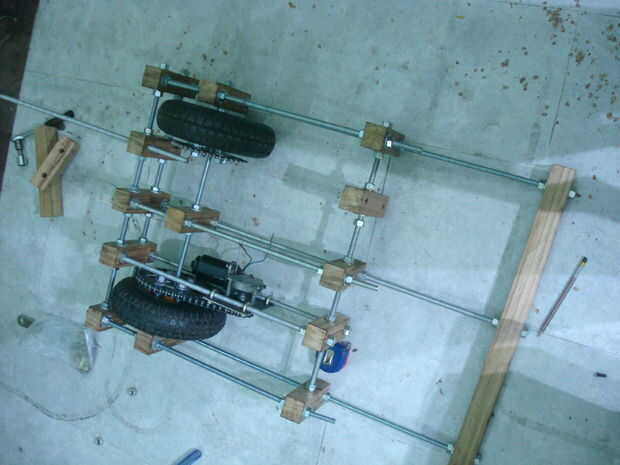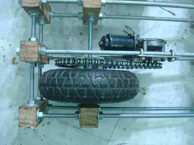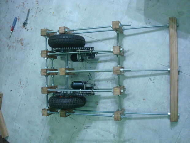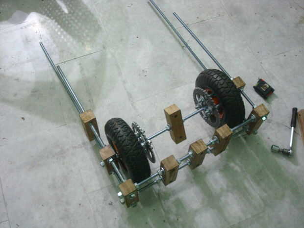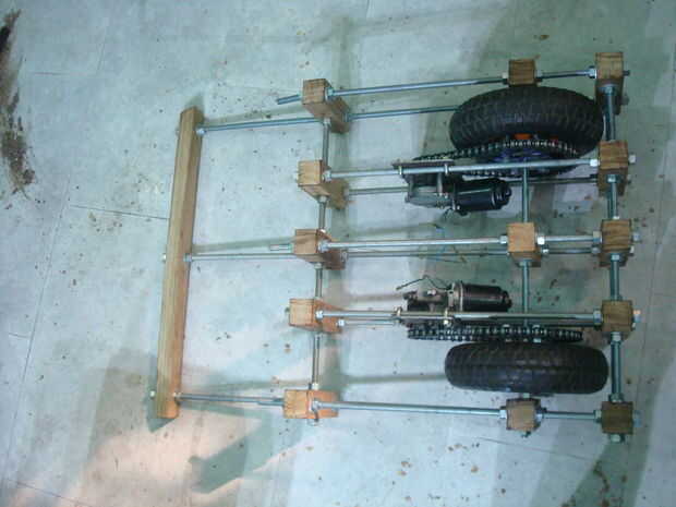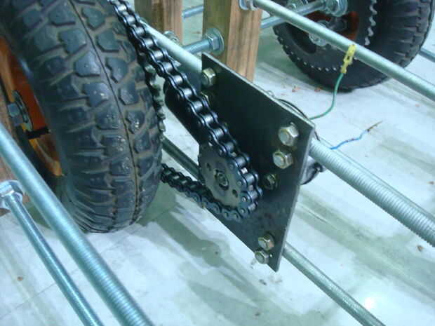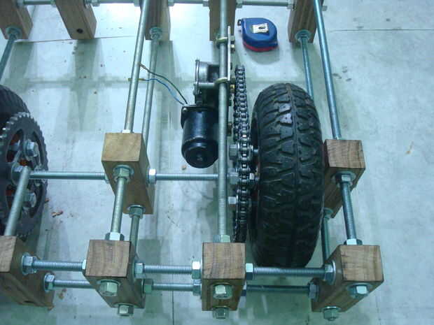 Juntas todas las piezas ensambladas. Tuvieron que abrirla o cambiar cosas muchas veces. Las imágenes son bastante auto explicativa. Montara los motores así. La cadena se corte según tamaño y luego recorta. Los motores se pueden mover hacia adelante y hacia atrás para aumentar o disminuir la tensión de la cadena.