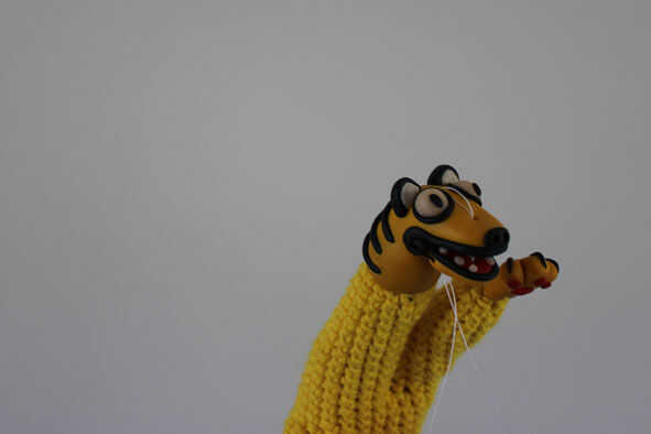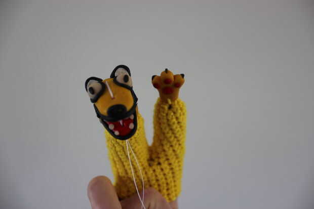 Es un fingerpuppet, apoyado sobre dos dedos. La mandíbula es operada por un cable que va alrededor del pulgar.