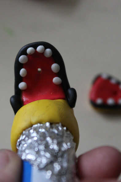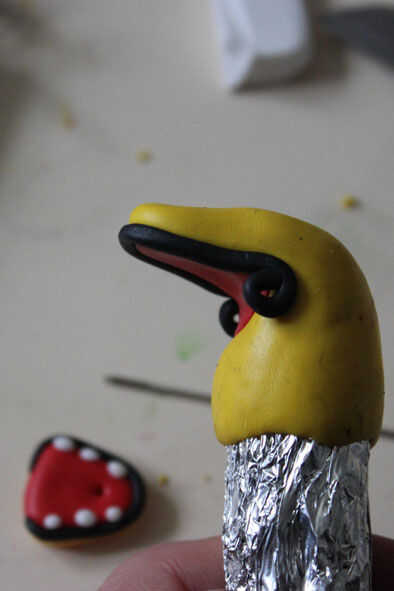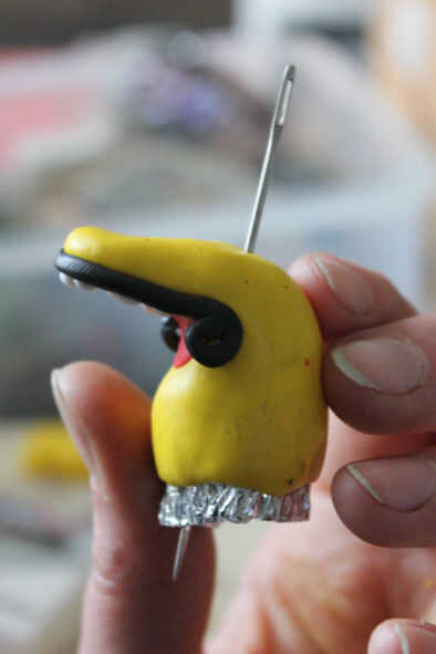 Alse perforar la parte frontal, debajo de la mandíbula. Lo hice después de fue cocido al horno, pero es más fácil hacerlo ahora.