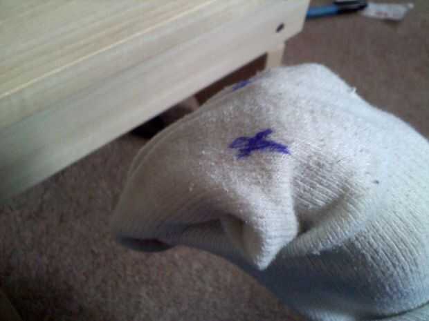 Poner el calcetín en la mano para tener una idea de donde estará la boca. La boca se creará por el pliegue entre los dedos y el pulgar.