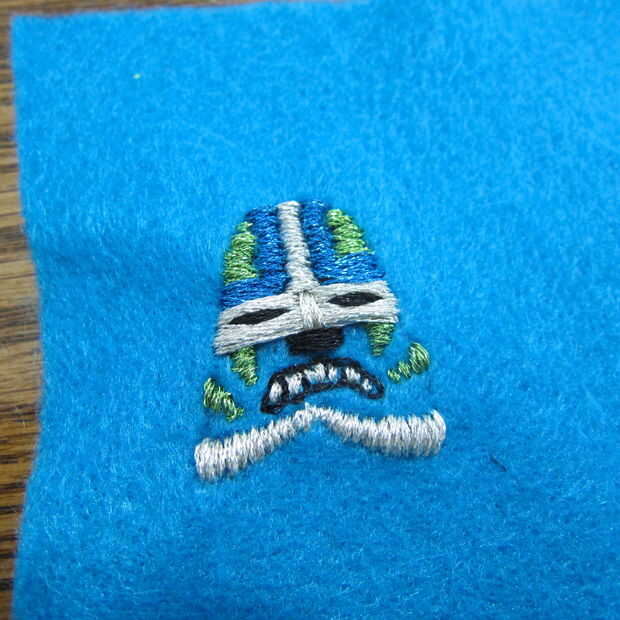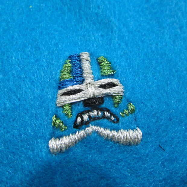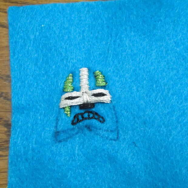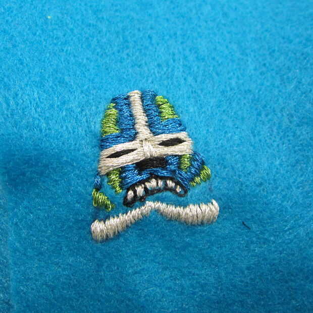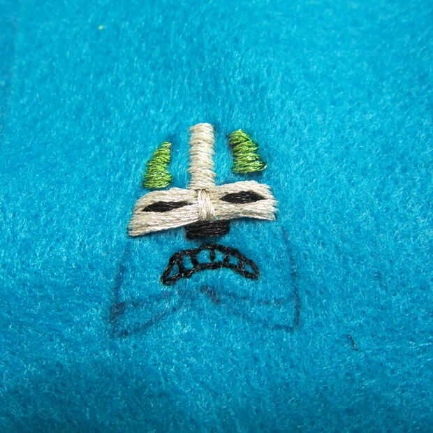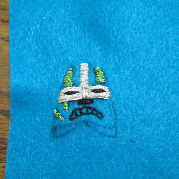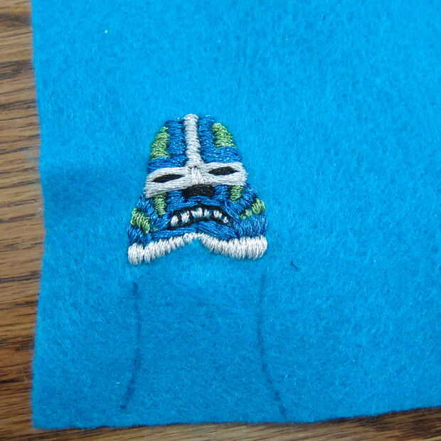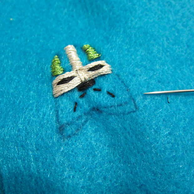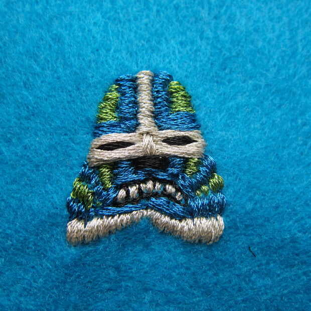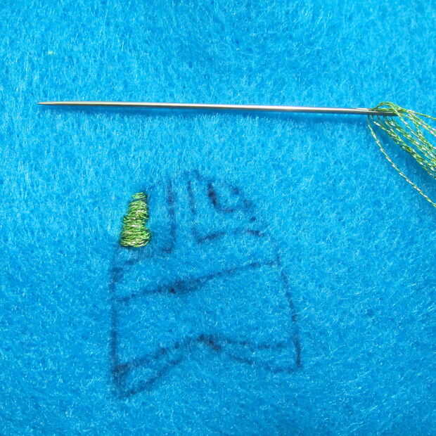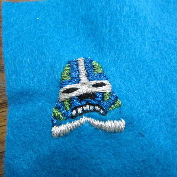Utilizando una necesidad y metálico bordado hilo costura de inicio. Usé una puntada del azote básicos para definir la máscara de todo carácter.