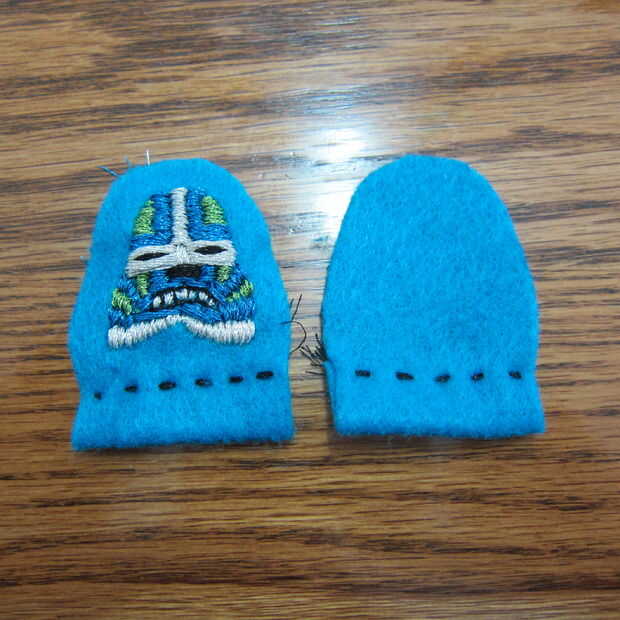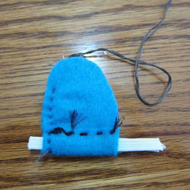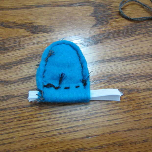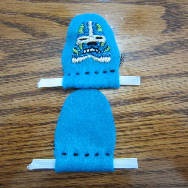 A su vez luchador lado derecho hacia fuera. Ajuste del pulgar dentro del luchador y el elástico de tracción suficiente para hacer cómodo alrededor de su dedo pulgar. Donde es la marca y coser las dos piezas de elástico. Cortar el elástico corto.