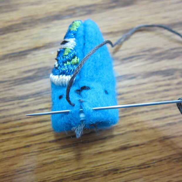 Colocar derechos de fieltro uno frente al otro y coser a lo largo de todo exterior excepto un lado del elástico. Mantenerla abierta por lo que te puede tirar firmemente para que la mascarilla se queda en el dedo pulgar firmemente.