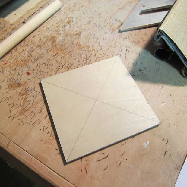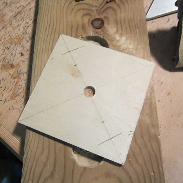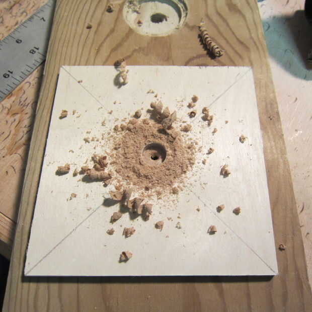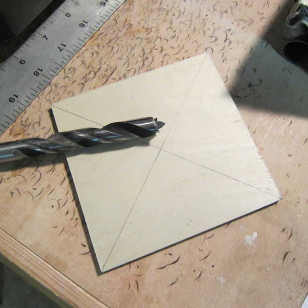 Dividir la plaza en cuartos diagonalmente para encontrar el centro. Usando un taladro y broca de taladro de 1/2 pulgada medio camino a través de la madera contrachapada para hacer un agujero para la manija de la arena.