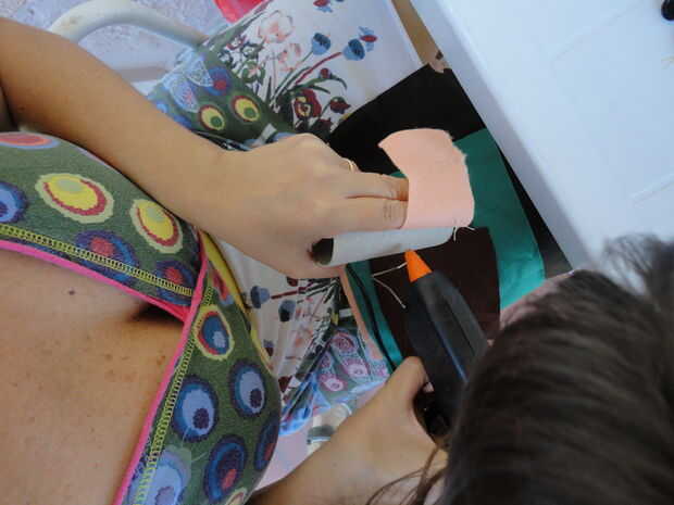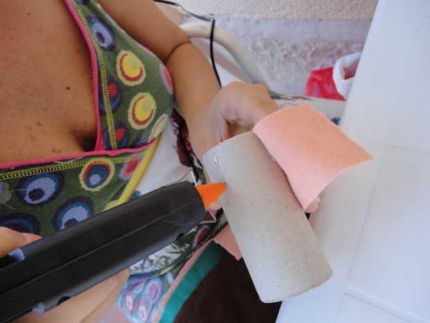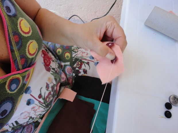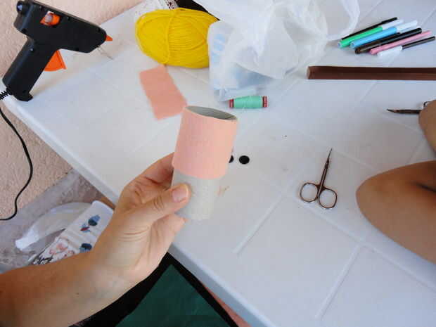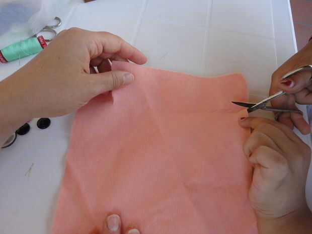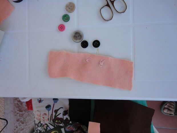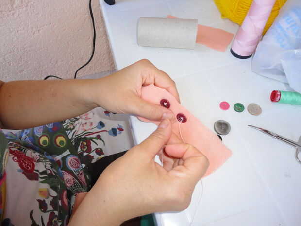 Corte la tela rosa para hacer la cara, coser los botones para los ojos y pegar el paño en rollo.
