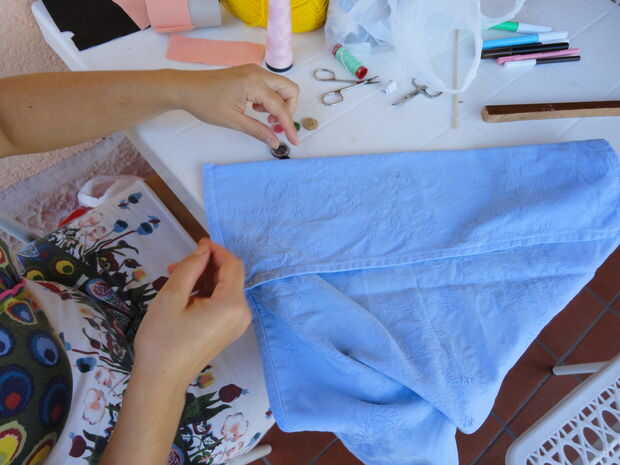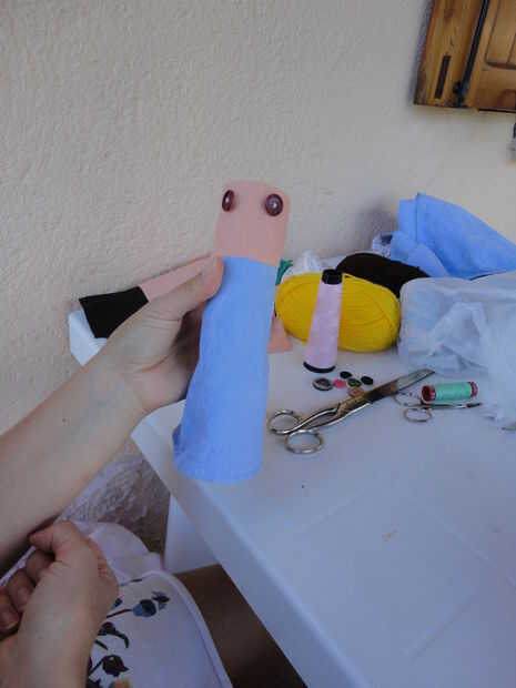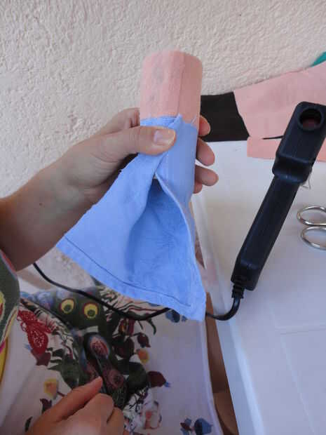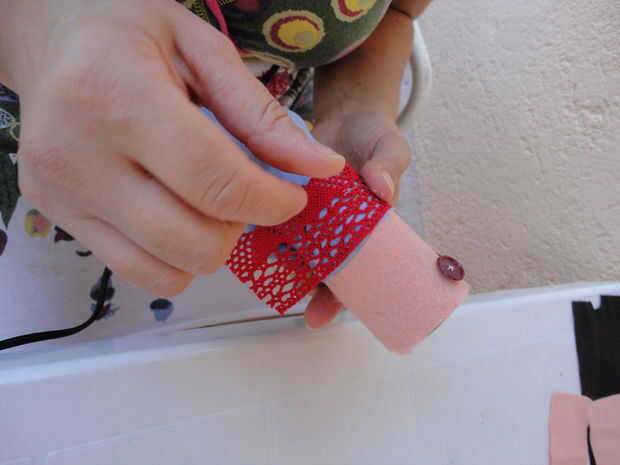 Corte la tela para el vestido y corte el cordón. Pasta en el rodillo como ves arriba.