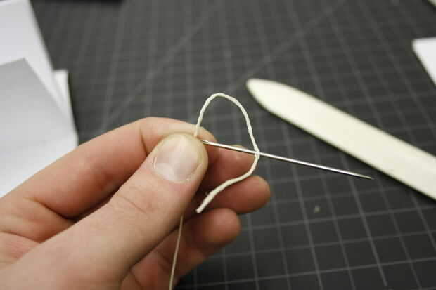 Una manera fácil de asegurar el hilo a la necesidad de libros de costura es roscado por el orificio del ojo y luego meter a través de dicho hilo en el mismo lado.