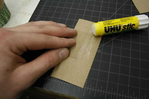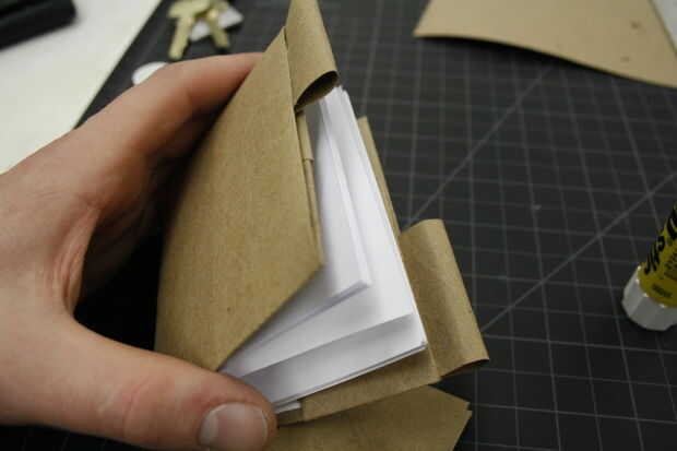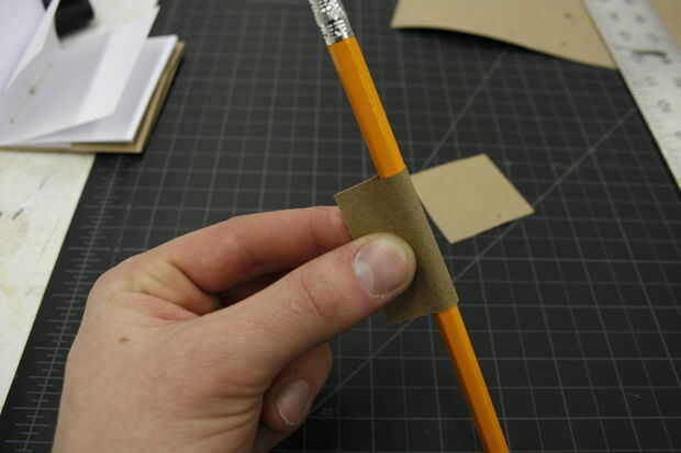 El sostenedor del lápiz se puede hacer de papel chatarra. Necesita dos piezas que son de 1 3/4 "x 2" Utilice el lápiz para encontrar el tamaño del lazo. Luego utilice un palillo de pegamento para fijar lazo juntos. Luego se pegan los lazos en los pliegues de la titular de la tarjeta.