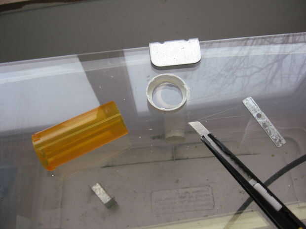 Utilicé un disco de pesado en mi Dremel para cortar la pieza de metal que necesitaba y cortar la parte inferior del contenedor de la portilla. Una vez que estos cortes me hicieron cambiar a un accesorio de corte de alta velocidad e hicieron un corte áspero en la tapa.