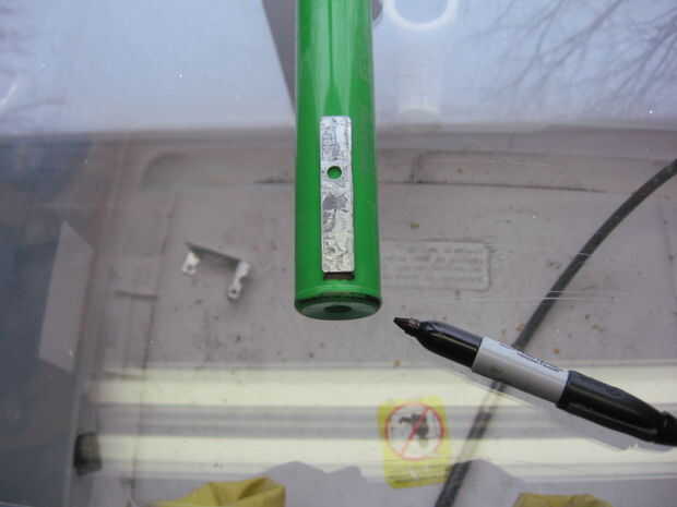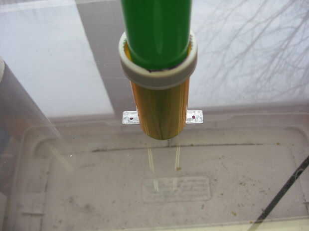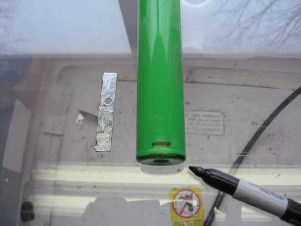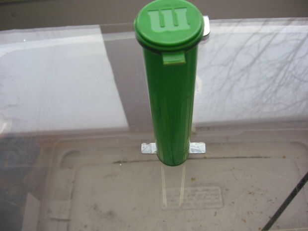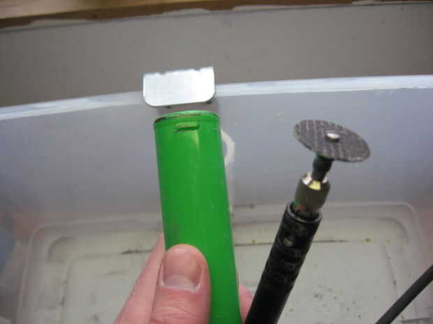 Poner la barra de montaje en el recipiente de cuerpo y utilizarlo como plantilla la marca la anchura de la barra. Elegí a una altura que se veía bien. Una vez que la marca es medir cuán alto es. Luego haga una marca a la misma altura y ancho de la barra de montaje en el lado opuesto del recipiente. Ahora utilice el Dremel con el disco de corte para cortar las ranuras en el cuerpo de las marcas. Una vez que las ranuras se hacen poner la tapa en el cuerpo. Luego deslice la barra de montaje en su lugar para que porciones iguales de la misma sobresalgan de cada lado.