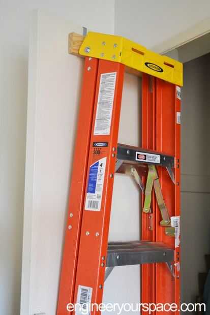 Atornillar los soportes a la parte superior de la puerta de mi armario, dejando la cara del agujero de la puerta libre. Este sistema funciona muy bien para mí y me gusta sobre todo el hecho de que mi escalera se almacena fuera de la vista pero no tengo que rebuscar en mi armario para llegar a él.