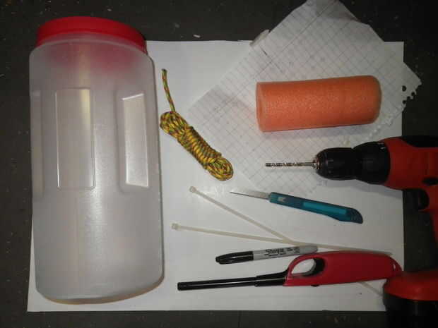 Envase plástico tapa del tornillo (que se muestra es de la tienda $) cuerda paracord o nylon, tallarines de la piscina, cintillo plástico.