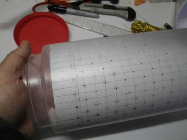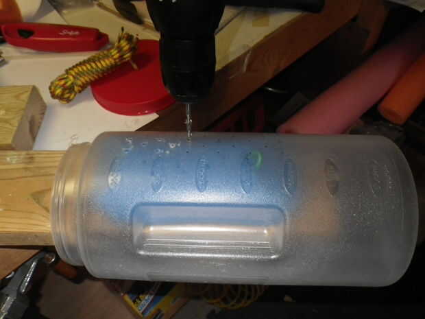 Coloca el papel dentro del contenedor y punto exterior del contenedor con marcador donde desea taladrar. Retire y luego perfore los orificios apoyando el interior del contenedor durante la perforación. Utilicé una madera de 2 "x 4" con un pedazo de los tallarines de la piscina interior (azul). Si su contenedor no transparente entonces puede cinta al exterior y perforar el papel.