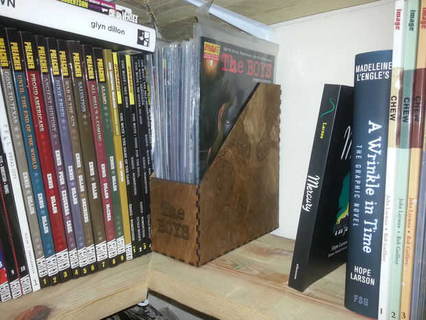 Mi pareja tiene cargas de comics monotemáticas, así que para ayudar a almacenar en la estantería que decidí hacer algunos cuadros personalizados estilo revista de soporte. Tengo acceso a un cortador láser en mi local hackspace así que decidió modificar un láser básico diseño de la caja para hacer el soporte de hojas de madera contrachapada.