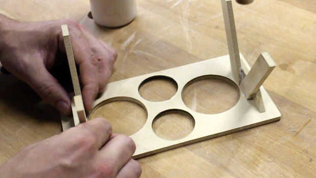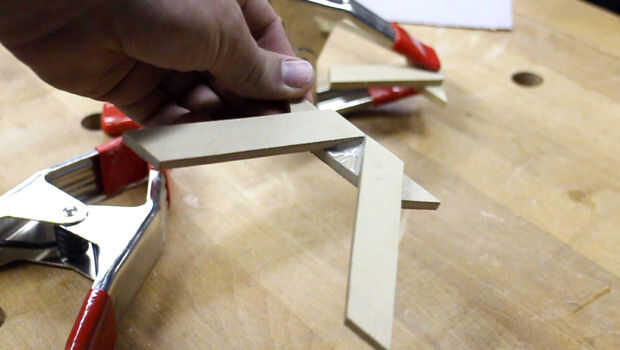 La Asamblea del braguero y pierna entonces estuviera pegada a la parte inferior de la tabla. Una vez más, las abrazaderas fueron utilizadas para mantener las piezas Unidas hasta que el pegamento ha secado.