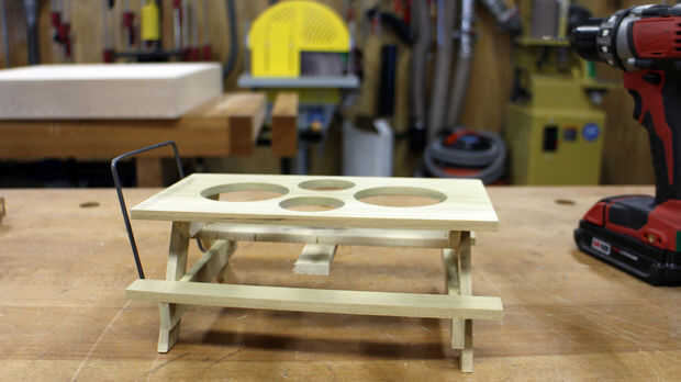 El sostenedor de la servilleta se une a la parte exterior de la tabla en las piernas y está hecho de alambre duro 3mm que encontré en la ferretería. Medí la distancia entre las piernas donde se intersectan el soporte del asiento y perforar una abertura para que coincida con el diámetro del alambre.