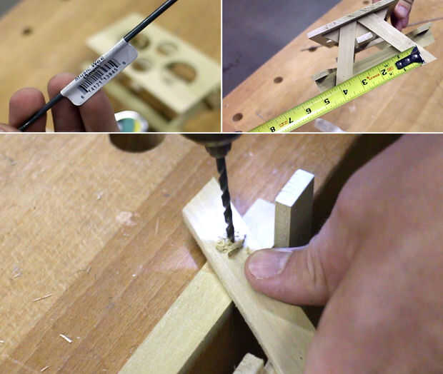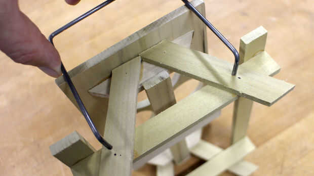 Utilizando la medida tomada, doblar el cable en 3 ángulos rectos con pinzas. El cable fue cortado a la longitud y pies pequeños se curva en cada extremo del alambre para insertar en los lados de la mesa.