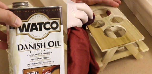 Para sellar y proteger mi mesa picnic usé aceite danés, un roce en el final que ofrece un acabado mate y duradero. Usar guantes de protección, y en un área bien ventilada, el aceite fue frotado en la mesa de picnic con un trapo y permite que absorba la madera. Fue limpiar exceso de aceite.