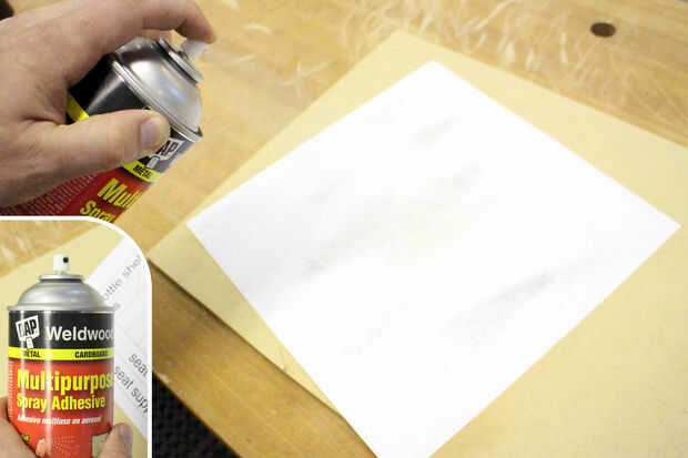 Con un spray adhesivo pegue la plantilla a la placa de 1/4" espesor de proyecto.