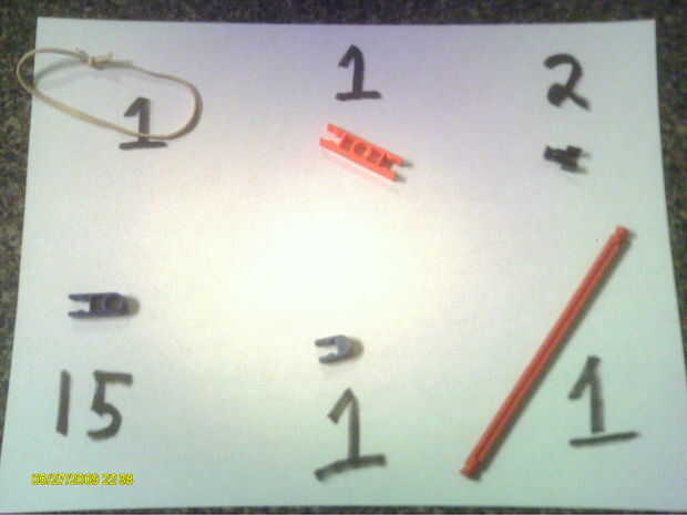 1 barra roja (2 º más grande), 1 goma, 1 conector de cara doble naranja, 2 mano de lego en forma de y no buscar piezas por igual, púrpura conector un agujero de 1 parte 15, 1 conector 1part ningún agujero. He intentado describir lo mejor que pude
