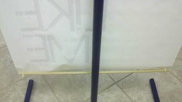 Una vez montado, el PVC con la pintura de aerosol de plástico de la pintura. Luego cuelgue la bandera. Os adjunto la parte superior de la bandera con lazos de alambre electrónico. Os adjunto una espiga de 3/8 de pulgada con lazos de alambre plástico en la parte inferior de la bandera para que la gravedad mantener tenso el banner.