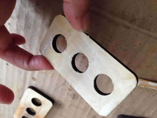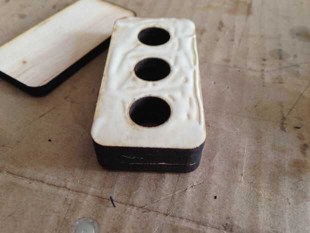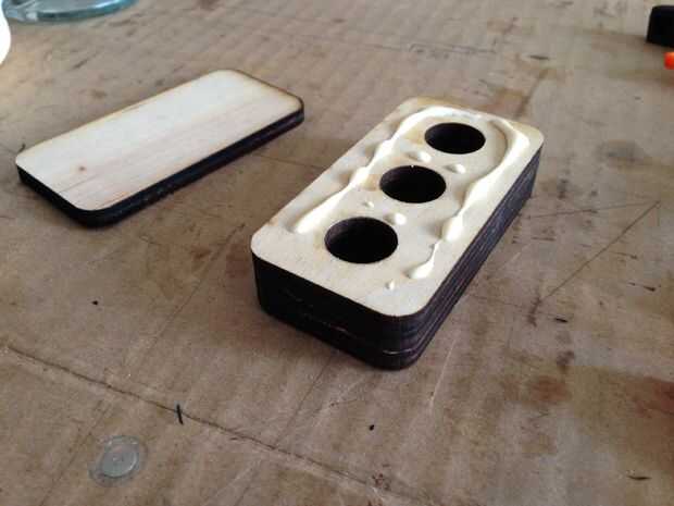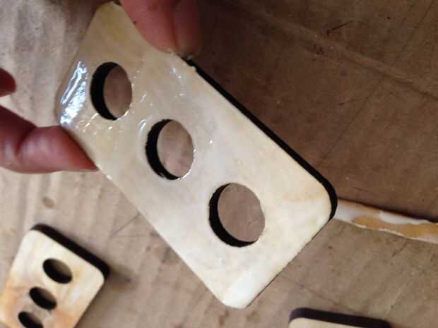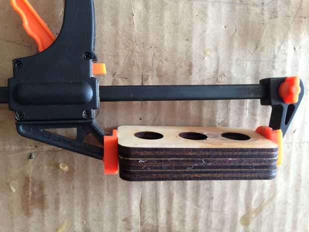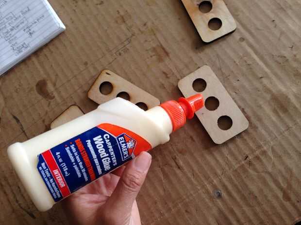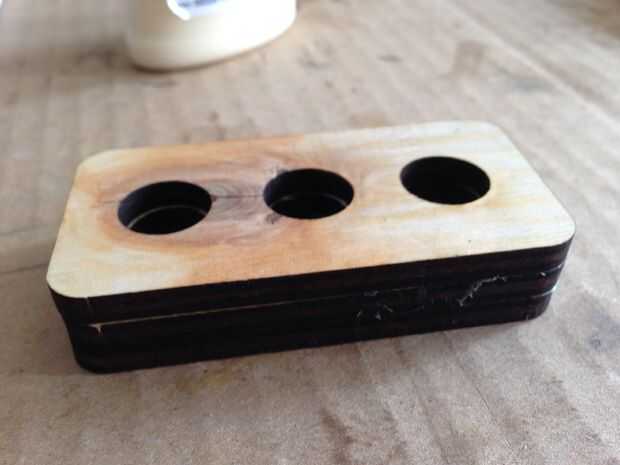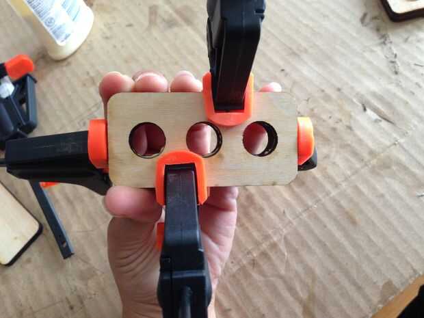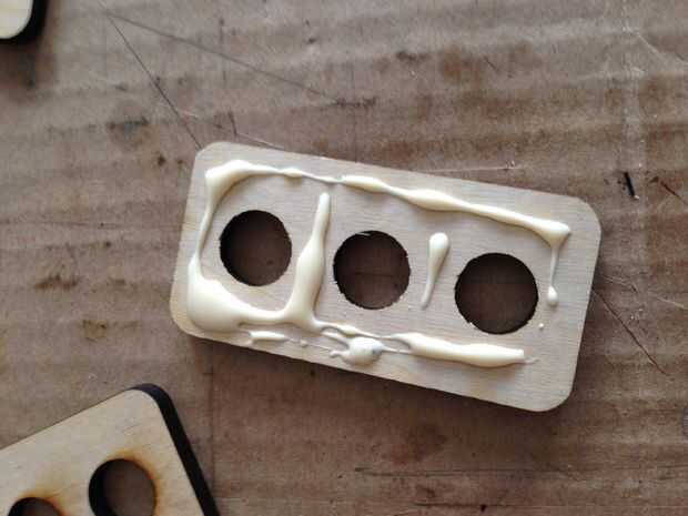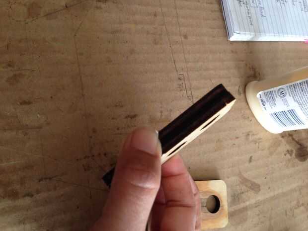Utiliza pegamento para madera y lo aplicó a la pieza. Luego tomó una varilla de mezclar café y extensión hacia fuera. Colocar las piezas juntas y fijarlo con la abrazadera. Paño del exceso de pegamento con un trapo húmedo. Juntar las piezas con los orificios primero, luego aplica la base.