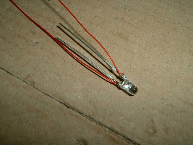 Envuelva una o dos bobinas en cada pin cerca de la base del LED y soldarlos con estaño como pocos como sea posible. Esto evitará que el pasador a crecer demasiado en diámetro para caber en los agujeros en el cintillo.