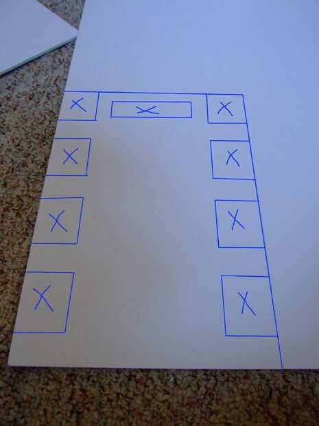 Crear una línea paralela 1 1/8" de la parte inferior del tablero y 2" de largo.  Desde el extremo de esta línea dibuje una línea paralela a la derecha 2 1/2" de largo.  Repetir hasta obtener el patrón en la imagen.