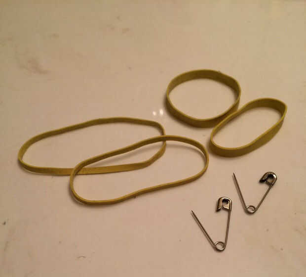 Se necesita 4 gomas y pasadores de seguridad. He usado gomas tamaño medianos pero si tiene más grandes que usted puede siempre les doble cuando te los pones en los pantalones.