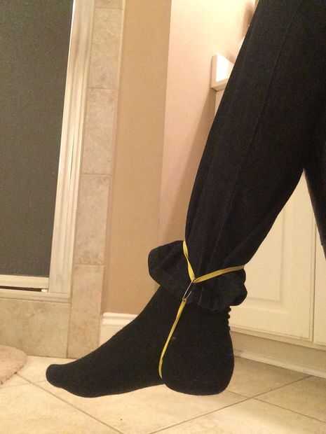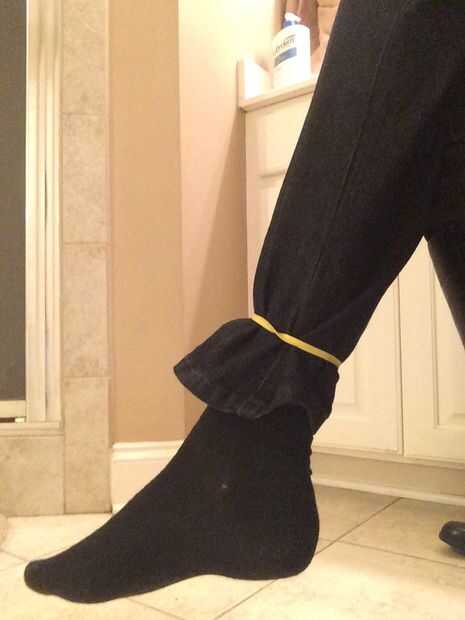 Deslice una de las bandas de goma en la pierna del pantalón. Ahora traen un bajo su pie y sujete la goma elástica con un alfiler. Esto ayudará a mantener la pierna del pantalón de desplazamiento hacia arriba. Ahora hacer lo mismo para la segunda etapa. Una vez que tengas que realmente no se siente la banda elástica. Hice una pierna para que podría ver la diferencia.