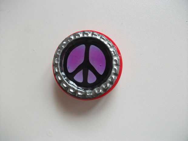 Símbolo de la paz: tomar una tapa de la botella y prepararla. Imprimir el símbolo de la paz, pegar dentro de la tapa y cubrir con barniz o mod podge magia dimensional.