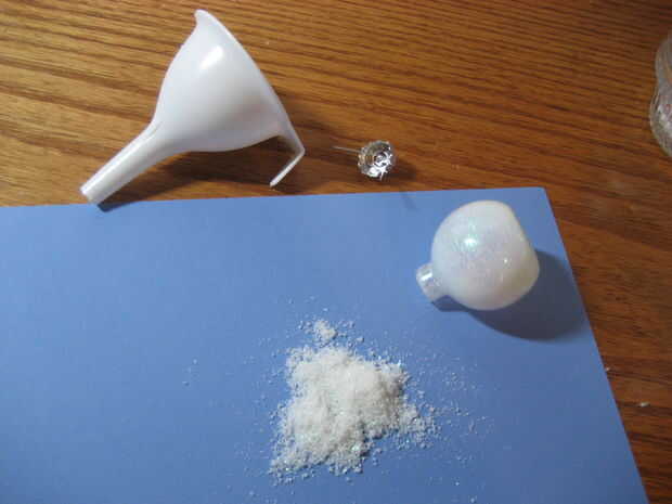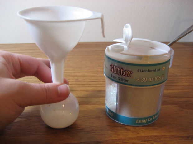 Vierta brillo en el adorno con el segundo embudo. Llenar aproximadamente la mitad completa. Remolino del ornamento para recubrir el interior con brillo. Vierta el exceso en el papel para su reutilización.