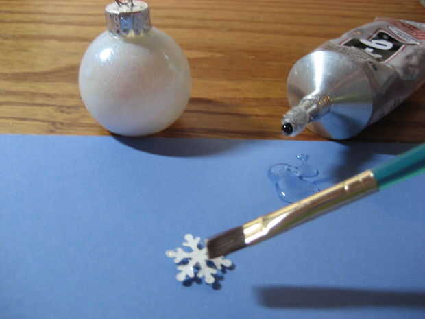 Pegue una etiqueta adhesiva que el ornamento usando el pegamento E6000. Un pincel puede usarse para ayudar a extender el pegamento sobre la parte posteriora de la etiqueta. Pegue la otra etiqueta en el lado opuesto de la ornamentación.