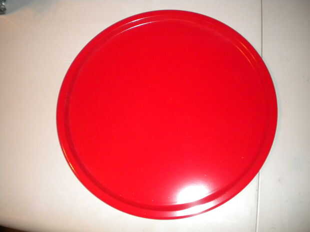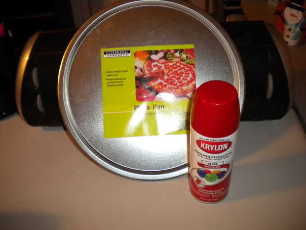 Primero, empecé con una pizzera. (Usted puede encontrar uno en el almacén del dólar)  Usé pintura en aerosol Krylon brillo en rojo de la bandera para cubrir la sartén.  Sólo necesita una capa y tomó unas horas para secar.